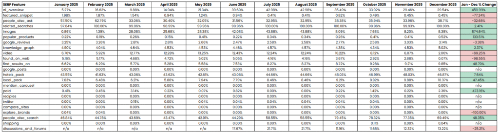 The real value comes from consistency. By pulling this data every month, patterns start to emerge. You can see how SERPs change, which features are becoming more prominent, and how visibility is shifting away from traditional blue links.